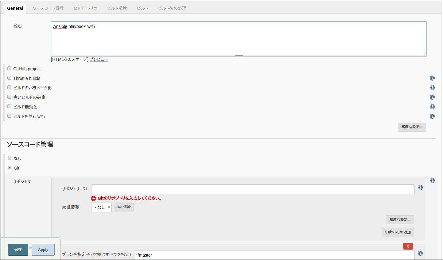 説明を適当に入れて、「ソースコード管理」で「Git」を選択。